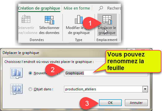 · Sélectionner votre graphique 1. Depuis les outils de Graphique > création de graphique, cliquer sur Déplacer le graphique 2. Sélectionner une feuille de destination (Vous pouvez la renommer) 3. Cliquer sur Ok pour Valider |