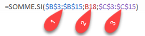 1) $B$3:$B$15 : L’argument plage qui contient tous les critères 2) B18 : L’argument critère. Si ce critère est trouvé dans la plage, SOMME.SI ajoute