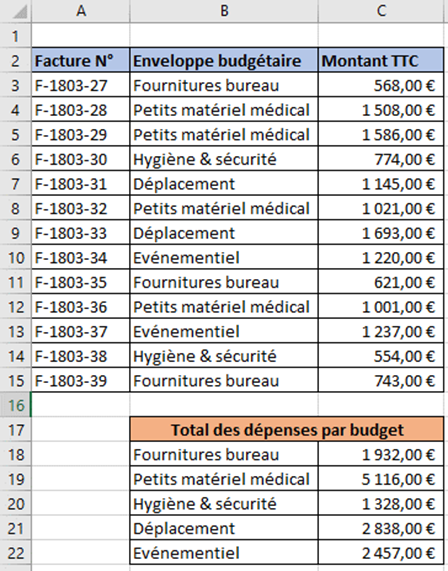 somme des dépenses en fourniture de bureau uniquement. Il faut donc utiliser un SOMME.SI :