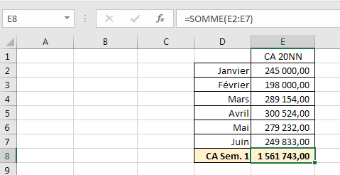 faire en E8 la somme des CA du semestre