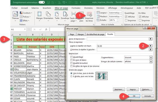 POUR QUE LES LIGNES DE TITRE D’UN TABLEAU S’IMPRIME SUR TOUTES LES PAGES. DEPUIS LE RUBAN MISE EN PAGE : 1. Cliquer sur imprimer les titres 2. Cliquer sur la flèche pour sélectionner 3. Cliquer-glisser sur les numéros de ligne des titres à imprimer 4. Cliquer sur Ok pour valider |