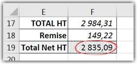 Pour Soustraire deux valeurs vous devez utiliser l’opérateur - Dans l’illustration ci-contre, pour calculer le Total net HT il suffit de saisir en F19 :